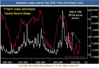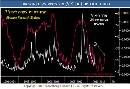 מדד התנודתיות, ה-VIX, הנגזר מסטיית התקן של זוגות אופציות על מדד ה-S&P500, ירד בשני ימי המסחר האחרונים מרמה של כ-40 נק' לרמה של 32 נק'. בתחילת החודש הגיע גם ל-48 נק'. התנודתיות הגבוהה הפכה באחרונה לאחד הנושאים המהותיים ביותר כשהבריחה משקיעים רבים שונאי סיכון מהשוק. מכון המחקר האסטרטגי Absolut מעריך שקיים קשר בעיכוב של 24 חודשים בין רמת התנודתיות של מניות לבין שיפוע העקום (המרווח בין תשואות האג"ח האמריקאי ל-10 שנים לבין התשואות לשנתיים), ראו גרף. ההסבר הכלכלי עשוי להיות שככל שהשיפוע תלול יותר כך ציפיות המשקיעים הן לשינויים חדים יותר בכלכלה, מה שמסביר גם עליה בתנודתיות במניות. אבל י לא ברורה הסיבה לעיכוב בין השניים (כאמור 24 חודשים). בכל מקרה, במידה והקשר הזה אכן קיים, לדבריהם "הוא לא אכזב אותם בחמש הנים האחרונות", צפויה רמת התנודתיות הטבעית לרדת משמעותית ואף מתחת ל-15 נק' עד לסוף השנה. ירידת התנודתיות, אם אכן תתרחש, וודאי תתמוך שוב בהגדלת רכיב המניות בתיק נכסי הציבור.
